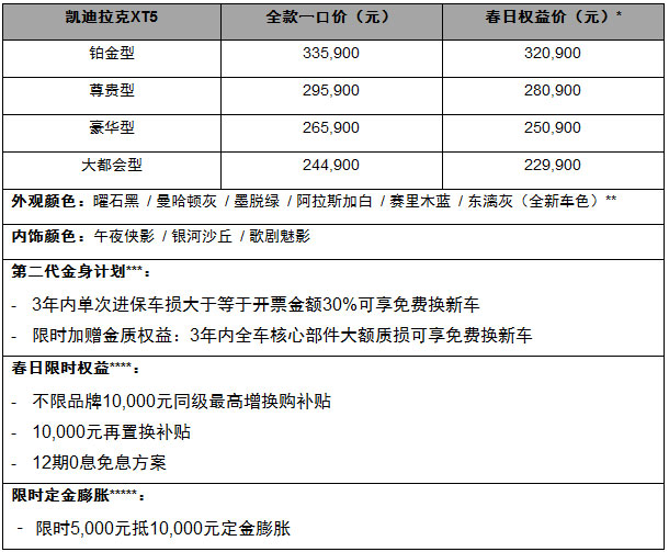 此次活动中,凯迪拉克XT5带来多重春日焕新权益:全新车色「东漓灰」正式亮相,限时选配价5000元,超跑质感触手可及;重磅升级第二代“金身计划”,在已有车损超三成免费换新的基础上限时加赠“金质权益”,三年内全车核心部件大额质损同样享受免费换新车,品质安全双重兜底。与此同时,凯迪拉克XT5推出多项春日限时福利,包括不限品牌10,000元同级最高增换购补贴、12期0息金融方案、5年内10,000元再置换补贴,叠加限时5,000元抵10,000元定金膨胀,春日限时权益价22.99万元起。